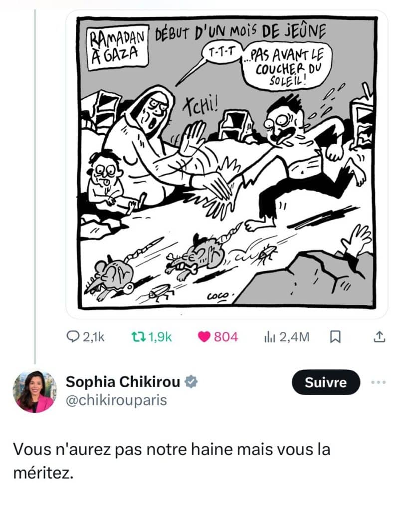 Pour séduire l’électorat des « quartiers populaires » sur lequel ils misent dans leur course au pouvoir, les Insoumis sont prêts à tous les coups, de préférence tordus. Ainsi, on a pu les voir défendre l’abaya à l’école ou se répandre en saumâtres propos flirtant avec un antisémitisme décomplexé. Depuis le 7 octobre, les sectateurs de Jean-Luc Mélenchon sont passés à la vitesse supérieure : il s’agit désormais d’afficher une complaisance sordide pour le Hamas et d’attaquer verbalement Israël dès que faire se peut. La députée Sophia Chikirou, très proche du Lider Minimo, mène la danse et ne rate jamais l’occasion de vomir sur un État qu’elle estime né « d’une colonisation, d’un apartheid et d’un génocide ». Rappelons que la fidèle de Jean-Luc Mélenchon a récemment retweeté un post de Rima Hassan, juriste en droit international, soutien indéfectible de la cause palestinienne et fraîchement intégrée sur la liste LFI aux européennes en place éligible. Sur cette publication, on pouvait lire : « Israël tue le vivant. Tout le vivant. C’est à ça que l’on reconnaît une entité coloniale fasciste. » Sophia Chikirou fait feu de tout bois et c’est maintenant à la dessinatrice de presse Coco, rescapée de la tuerie de Charlie Hebdo et officiant à Libération, qu’elle s’en prend. La raison ? Une caricature sur Gaza à l’heure du Ramadan. Il faut faire preuve d’une grande mauvaise foi pour suspecter de parti pris anti-palestinien une illustratrice qui croque avec la même férocité le Hamas et Israël.