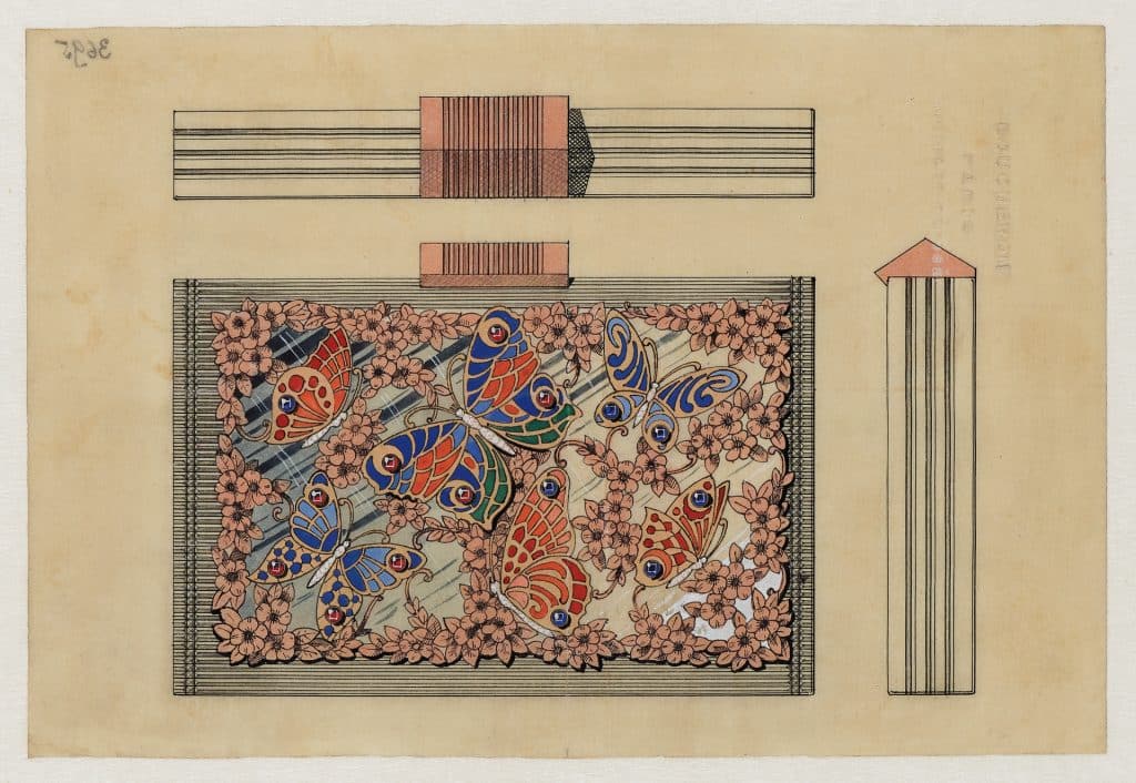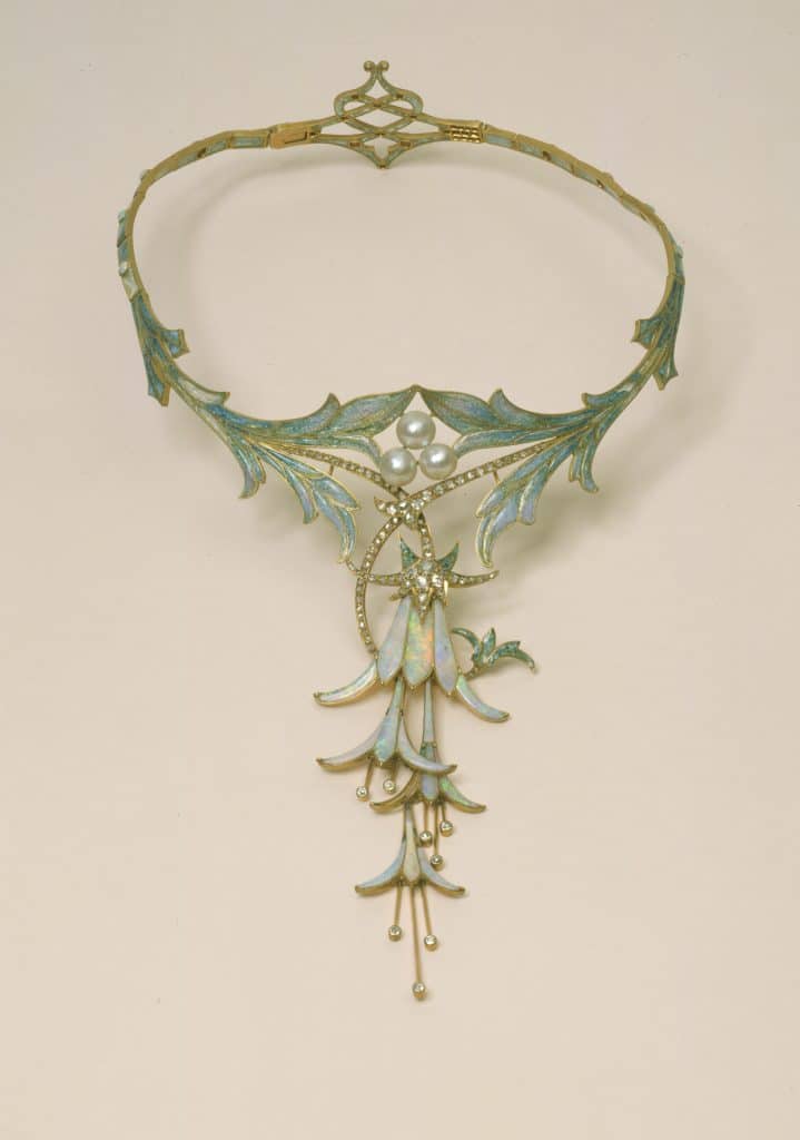 On s’y égare dans un jardin enchanté, comme avec ce nécessaire du soir dessiné pour la maison Boucheron où papillons fabuleux et insectes fantasmés, en émaux et diamants, se perdent dans une végétation d’or pur. Ou avec ce collier réalisé par le joaillier Georges Fouquet à partir d’un dessin de Charles Desrosiers et représentant des fleurs de fuchsias, tout en diamants, perles et émaux, destinées à tomber en cascade sur la gorge d’une élégante.