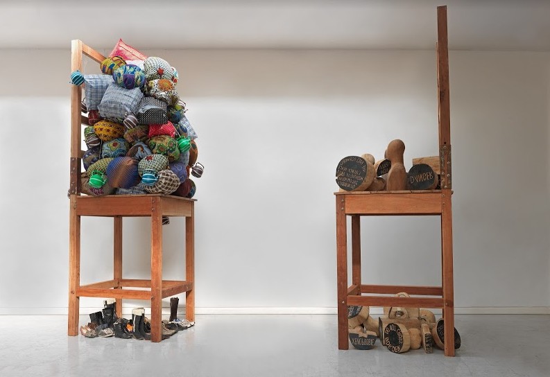 Un peu plus loin, je m’approche de sacs, genre sacs de café, alternant sous la cimaise avec des sandales en corde. C’est le grand prix de la fondation Ricard, une sorte de chef-d’œuvre annoncé, en somme. Cette fois, je commence par lire le cartel. Autant aller directement à l’essentiel ! Pour préparer son œuvre, le créateur, « un artiste émergent de la jeune scène française », a rencontré des paysans expulsés de leurs terres dans un bidonville de Colombie. Il leur a demandé d’écrire leur histoire et leurs revendications sur des sacs de jute au moyen de marqueurs noirs, puis de détricoter la toile et de s’en faire des sandales. Je prends un peu de recul. Je réfléchis. J’aimerais quand même trouver au moins une fois la solution par moi-même… L’artiste veut-il carrément se foutre de la gueule des paysans concernés en leur faisant fouler au pied ce qui leur tient le plus à cœur ? Souhaite-t-il, au contraire, que ces écrits transformés en chaussures les aident allégoriquement à se mettre en marche et à prendre un nouveau départ ? Difficile de trancher entre ces deux interprétations contradictoires. Je me penche à nouveau sur le cartel pour connaître la bonne réponse. C’est encore autre chose : l’artiste veut tout simplement proposer aux expulsés un « outil de résilience ».