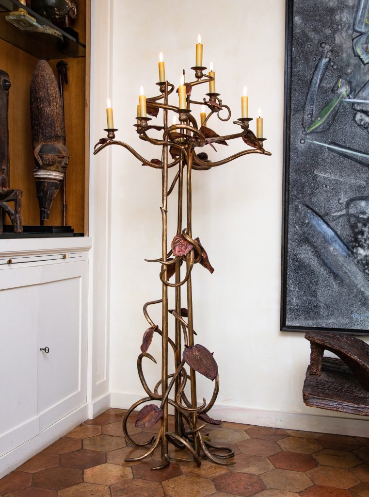 C’est une histoire d’amitié, une histoire de passion et une histoire de transmission. Daniel Marchesseau, ancien conservateur au musée d’Art moderne de Paris (1973-1981), au musée des Arts décoratifs (1981-1990) puis directeur du musée de la Vie romantique (1999-2012), est également un grand collectionneur. Parmi les œuvres d’art qui composent son cadre de vie, un ensemble exceptionnel de pièces créées par Claude et François-Xavier Lalanne qu’il a patiemment constitué durant des décennies. Ce couple d’artistes inclassables, jouant avec les formes et les matériaux pour donner naissance aux plus curieux objets, meubles et sculptures qui soient, il l’a bien connu. Claude et François-Xavier ont été ses amis, ses voisins à la campagne, en Seine-et-Marne, et c’est pour eux qu’il a organisé cette exposition qui devait marquer les esprits, en 1998, dans les jardins de Bagatelle. Daniel Marchesseau leur achète certaines pièces, leur en commande d’autres inédites et eux lui en offrent. L’ensemble est remarquable : une grande torchère végétale à onze chandelles, un large lustre aux papillons et aux souris à seize bougies, un centre de table, des appliques en rameaux, une lanterne à trois feux, des couverts, des bougeoirs, des salières, un mouton, une tortue-topiaire… Toute la créativité et l’originalité des Lalanne sont ici consacrées par le sceau de l’amitié.