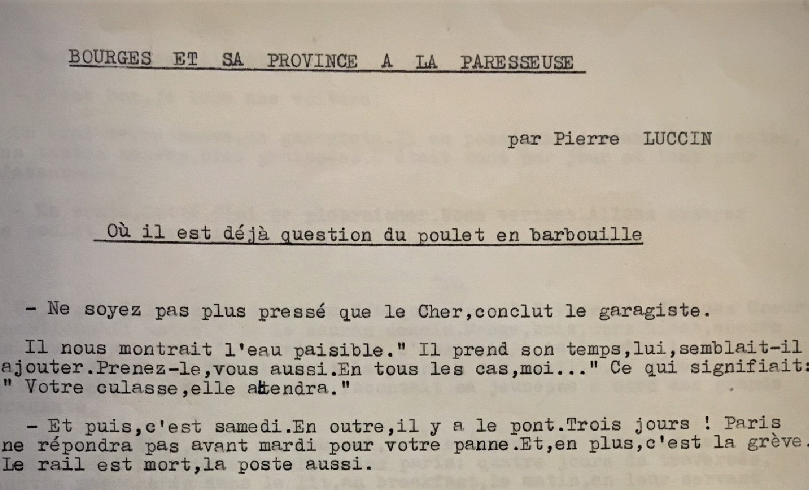 Pourquoi Pierre Luccin, le bordelais avait-il écrit une nouvelle sur la campagne autour de Bourges ? Lui avait-on commandé ou était-ce une initiative personnelle ? Quels organismes (municipalité, office de tourisme, etc…) avaient bien pu le mandater ? Pour quelles raisons ? L’écrivain avait-il des liens avec ce département du centre de la France ? Même la date de parution était accompagnée d’un point d’interrogation.