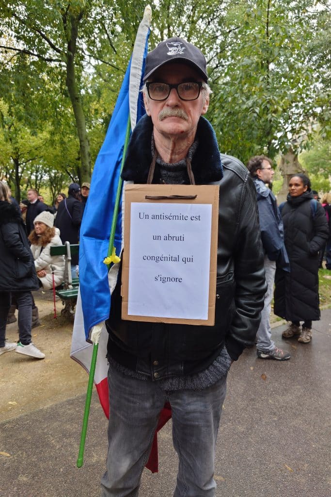 Relégués en queue de cortège, le Rassemblement national et « Reconquête ! » avaient appelé leurs militants et sympathisants à se retrouver sur la place Salvador Allende avant de rejoindre l’esplanade des Invalides, lieu de départ de la marche pour la République et contre l’antisémitisme, sous bonne escorte des forces de l’ordre et du gendarme de Groland sur Canal+ qui porte une pancarte autour du cou « Un antisémite est un abruti congénital qui s’ignore ». François, 73 ans, Normand, sympathisant « Reconquête ! » est venu soutenir « nos frères Juifs Français ». Il ajoute qu’ « il faut qu’on arrête de les faire chier ».