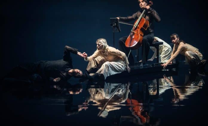 Sur une vaste étendue noire et réfléchissante (décor d’Erika Turunen) qui ressemble aux eaux mortes d’un étang scintillant obscurément, Saarinen expose danseurs et musiciens dans des ensembles torturés où l’œil ne fait plus la différence entre les uns et les autres tant leur fusion peut être parfaite. Ce qui en soi est une prouesse quand on sait combien nombre de musiciens, surtout à côté des danseurs, apparaissent sur scène comme des albatros sur le pont d’un navire. Au tout début de l’ouvrage, le chorégraphe les mêle dans des compositions spectaculaires, héroïques et baroques, où ils construisent des tableaux vivants avec un rare bonheur sous des pluies de lumières (Fabiana Piccioli, Sander Loonen) tombant en pluie des cintres. Et le plus étrange dans cet univers si moderne, cerné des quatre côtés par les gradins où siège le public, plongé dans des compositions musicales qui sont furieusement de notre temps, c’est que les danseurs en viennent à ressembler, dans leurs attitudes figées, à des figures mythologiques, à des statues de marbre blanc, telles qu’on les voit à Rome surgissant des fontaines du Bernin ou à Versailles au sein des bosquets voulus par Le Nôtre. Des figures qui se réfléchissent théâtralement sur le sol noir comme elles se reflèteraient dans les eaux d’un ténébreux bassin.