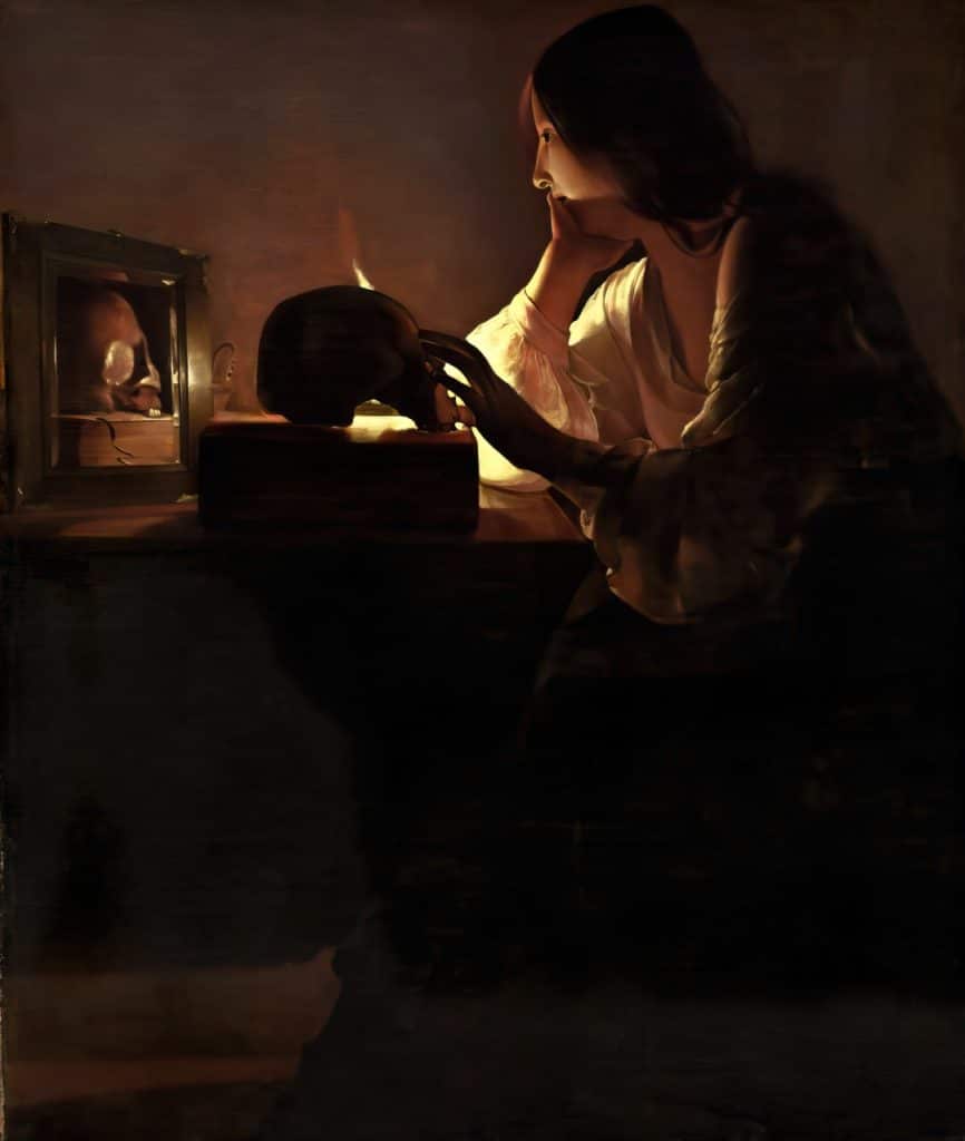 Le public viendrait-il pour sa peinture ? Avouons qu’elle est assez éloignée des codes de notre modernité. Les « gueuseries » de Georges de La Tour, avec ses vielleurs (joueurs de vielle), ses bagarres de musiciens ivrognes, ses pauvres hères aux dents gâtées (« nos infirmités sont la monnaie de nos grâces », disait Christian Bobin) et ses diseuses de bonne aventure, renvoient moins au mouvement populo-littéraire et anti-écolo d’Alexandre Jardin qu’aux fameux « sans-dents » de François Hollande – l’ex-président de la République française, et non, malheureusement, le célèbre peintre de la Renaissance portugaise Francisco de Hollanda. Quant à ses saints – Jacques, Grégoire, Pierre, Thomas et les autres – ou ses Madeleine pénitentes, notre déchristianisation à marche forcée nous les rend chaque jour plus étrangers. Il faut désormais un cartel explicite pour qu’un vieil homme, les yeux baignés de larmes et accompagné d’un coq, redevienne saint Pierre pour les lointains descendants de François de Malherbe que nous sommes devenus – « Ces beaux yeux souverains qui traversent la terre / Mieux que les yeux mortels ne traversent le verre », écrit-il dans Les Larmes de saint Pierre (1587). De leur côté, nos Marie-Madeleine contemporaines, alias saintes MeToo confrontées aux affres du consentement, préfèrent le suréclairage médiatique à la flamme filante de méditations nocturnes, le regard perdu entre les crânes, les miroirs et les livres.