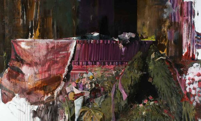 La tragédie ne relève pas d’un simple exposé objectif des faits. Il y a souvent quelque chose d’autre, quelque chose qui a partie liée avec l’émotion. Il peut s’agir d’un rythme, d’une vibration, d’une « petite musique » propre à chaque auteur. Chez Ghenie, ce sont les matières et la picturalité qui apportent cette scansion. Ses œuvres présentent en effet une richesse de matière tout à fait fascinante. Il travaille par couches successives qui rehaussent la texture finale, maltraitant les surfaces pour provoquer d’heureux hasards. Il projette, il efface, il arrache, il applique des pochoirs, il gratte, préférant manier des sortes de spatules (ou couteaux) qui posent et étirent la peinture, plutôt que le pinceau. En raclant des noix de matière dans plusieurs tas de couleurs, qu’il écrase sur ses toiles, il produit des effets berlingots caractéristiques de sa manière. Au total, si l’on faisait un gros plan sur une partie de l’une de ses œuvres, on serait en pleine abstraction. C’est ce qui donne à ses travaux tout leur lyrisme. Dans un contexte où l’abstraction a beaucoup décliné, voire presque disparu, le fait mérite d’être souligné. Chez Ghenie, l’abstraction sert la figuration, elle en devient une composante.