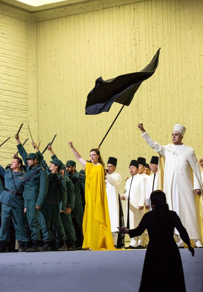 L’extraordinaire dramaturgie du compositeur dans sa maturité, cette partition sublime, tout à la fois rutilante et onctueuse, au lieu d’être servies par la mise en scène, semblent ici les supports d’occasion d’un discours sans lien organique avec le livret. Par une curieuse interversion, l’opéra est ici sommé d’obéir aux injonctions de la scénographie. Laquelle donne à l’Égypte ancienne des pharaons le profil d’une théocratie sanguinaire, signalée, dans un vestiaire amorti par un vague syncrétisme (histoire de ne pas désigner précisément l’Iran – je ne nomme personne, suivez mon regard), par les longues barbes et les costumes voilés de noir de l’oppresseur, par opposition aux Éthiopiens prisonniers, tandis qu’Amneris, la rivale d’Aïda, fait d’acte en acte les essayages chromatiques de ses longues traînes de gaze, où elle se prend parfois les pieds et qui, au fil des tableaux, passeront du blanc au rouge ou au jaune –  faut-il y voir un symbole ? Pendant la durée interminable des changements de décor, la salle est priée de patienter en silence.