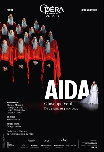 Aïda. Opéra en quatre actes de Giuseppe Verdi. Avec Krysztof Baczyk, Eve-Maud Hubeaux/Judit Kutasi, Aioa Hernandez/Ewa Ptonka, Piotr Beczata/Gregory Kunde… Direction : Michele Mariotti/ Dmitry Matvienko. Mise en scène et vidéo : Shirin Neshat. Orchestre et Chœurs de l’Opéra national de Paris.