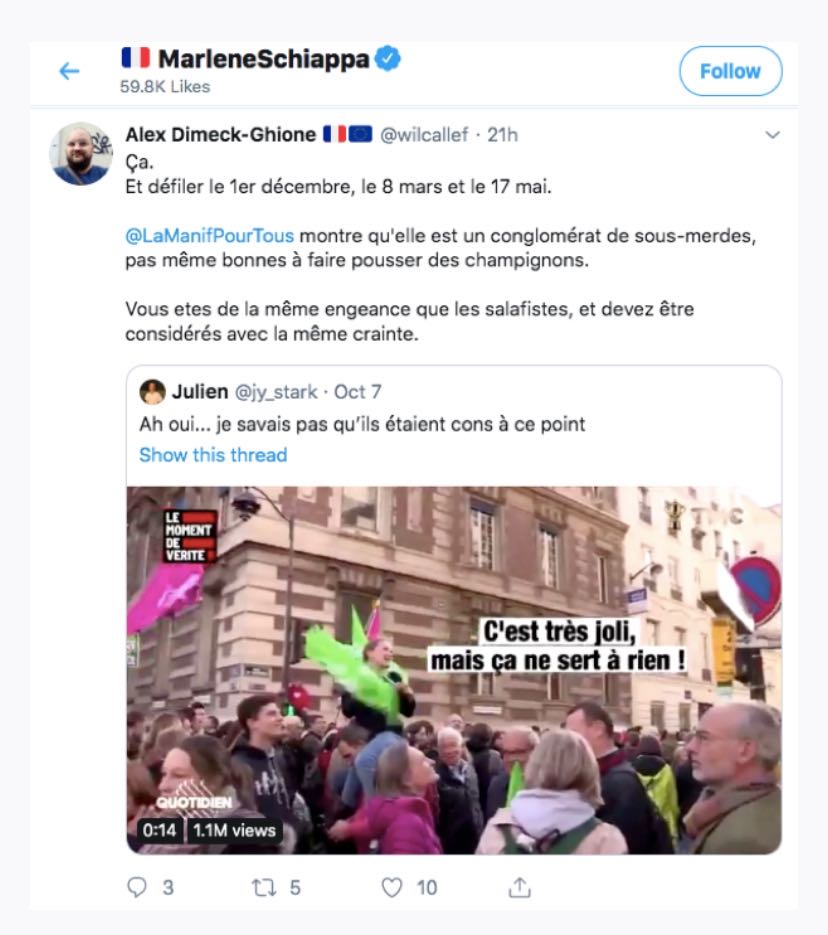 Dans le même esprit chaleureux, Marlène Schiappa (qui avait vu entre la “Manif pour tous” et les « terroristes islamistes » une « convergence idéologique ») a lu un des tweets du militant LGBT Alexandre Dimeck-Ghione et y a reconnu une forme d’acquiescement à l’idée qu’elle se fait des possibilités de manifester pacifiquement en France. Elle a donc promptement nommé le sus-nommé au poste de conseiller de la secrétaire d’État chargée de l’Egalité entre les femmes et les hommes.