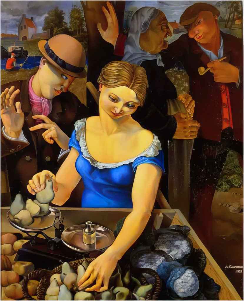 Courmes (1898-1993) était à sa place, place du Combat : cet artiste insolent, féroce, facétieux, iconoclaste, érudit, a eu sa carte du Parti pendant dix ans –de 1936 à 1946 ! Effet de mode ? Picasso, Léger, Arroyo, Gilles Aillaud en étaient, eux aussi. Sans compter les surréalistes. L’artiste a relativisé rétrospectivement la portée de ce compagnonnage de circonstance. Courmes savait-il sa chance de vivre à l’ombre de Paris, non sous la terreur stalinienne ? Dès 1934, ce natif de Bormes-les-Mimosas, d’abord établi au Lavandou avant de s’installer à Ostende, a pris souche au bord du canal Saint-Martin, toile de fond de nombre de ses tableaux.