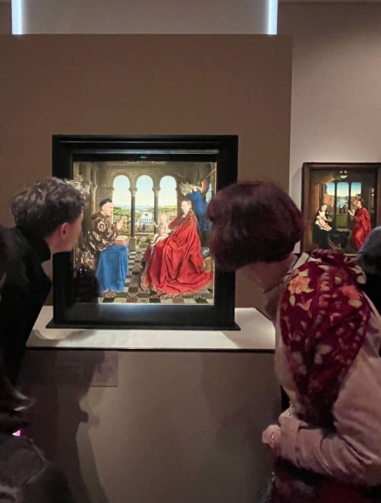 Nous vivons dans un monde d’images, de reproductions gratuites immédiatement accessibles, et nous faisons la queue pour voir des tableaux. C’est une très bonne nouvelle. Nous vivons aussi dans la société du « pas d’souci » – formule fourre-tout que l’on entend à longueur de journée et qui peut vouloir dire, selon les circonstances « oui », « au revoir », « merci », « de rien ». « Pas d’souci » : plus rien n’a vraiment d’importance ni ne sort du lot. Dans ce contexte un peu lamentable, voir des gens s’approcher au plus près des toiles ou prendre en photo le détail d’une œuvre – un détail qui compte pour eux à ce moment de leur existence – a quelque chose de très réconfortant. Troisième bonne nouvelle : le titre que le Louvre donne à la présentation au public, après restauration, de La Vierge du chancelier Rolin : « Revoir Van Eyck ». Revoir, c’est bien sûr voir à nouveau, après l’absence, mais c’est aussi (le préfixe « re » a ce double sens) voir avec plus d’attention, y mettre l’insistance d’un regard appuyé. On ne revoit pas grand-chose de nos jours : on « scrolle », on fait défiler, on tourne la page. Revoir Van Eyck est une heureuse formulation et offre, au-delà de l’œuvre allégée des couches successives de vernis qui avaient fini par l’assombrir, de bien belles perspectives d’approfondissement du regard.