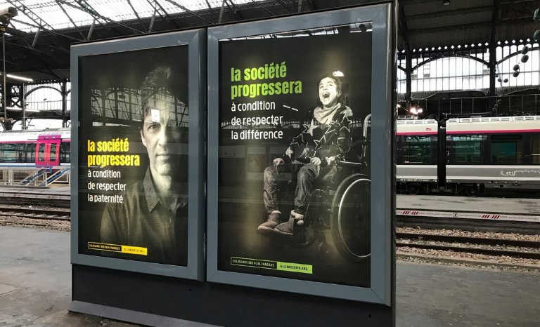 L’association conservatrice entend interpeller l’opinion avant la reprise des débats sur la loi de bioéthique ce mercredi au Sénat. Elle se borne à promouvoir la paternité et la maternité à l’ancienne si on ose dire. Sans chercher à choquer ni à agresser qui ce soit – rien à voir par exemple avec les images-choc diffusées par L214 pour nous sensibiliser à la souffrance animale (non sans efficacité). Alliance Vita a choisi des visuels très doux et assez élégants : deux portraits en noir et blanc, l’un d’homme, l’autre de femme, sont accompagnés de la phrase « La société progressera quand elle respectera la paternité/la maternité ». Respecter la paternité ou la maternité : pour les tenants de la procréation sans sexe (et sans père), cette proposition est scandaleuse. Un troisième visuel, placardé sur un autre réseau d’affichage, montre un handicapé accompagné de la phrase : « La société progressera quand elle respectera les différences ».