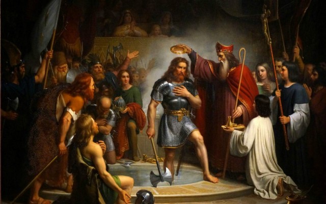 On m’a récemment interrogé sur la grande question de savoir si « récit » ou « roman » sont des expressions adéquates pour évoquer l’enseignement de l’Histoire. Avec une certaine pertinence et pas mal d’humour, le site a illustré l’interview d’un tableau célèbre représentant le baptême de Clovis, peint par François-Louis Dejuinne (1786-1844) :