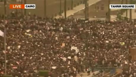 Je n’ai pas souvenir d’un tel plan fixe, en direct, sur autant de chaînes différentes et pendant aussi longtemps (les trois jours qui précèdent le « vendredi du départ »[2. Le vendredi 4 février, jour de la prière]). Vous pouvez zapper ad lib, vous tombez sans cesse sur cette même diapo animée, nouvelle mire du PAF, la place où la focale mondiale s’est postée pour guetter l’Histoire en train d’accoucher.