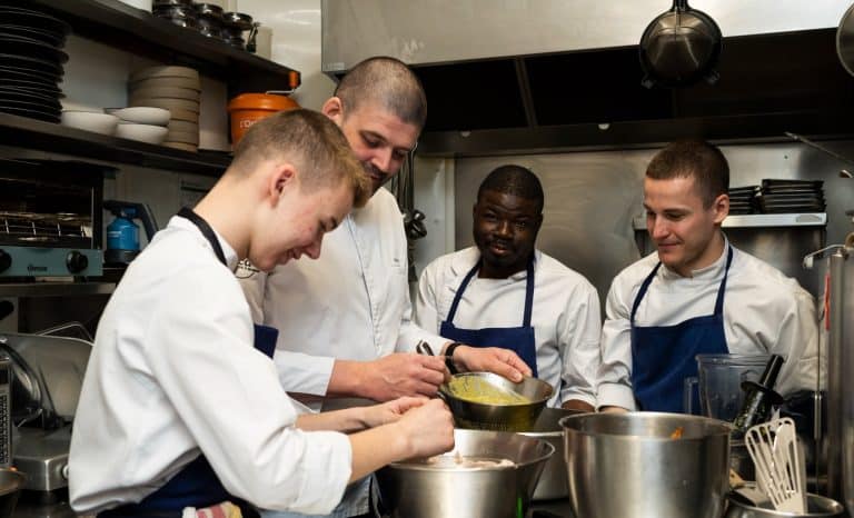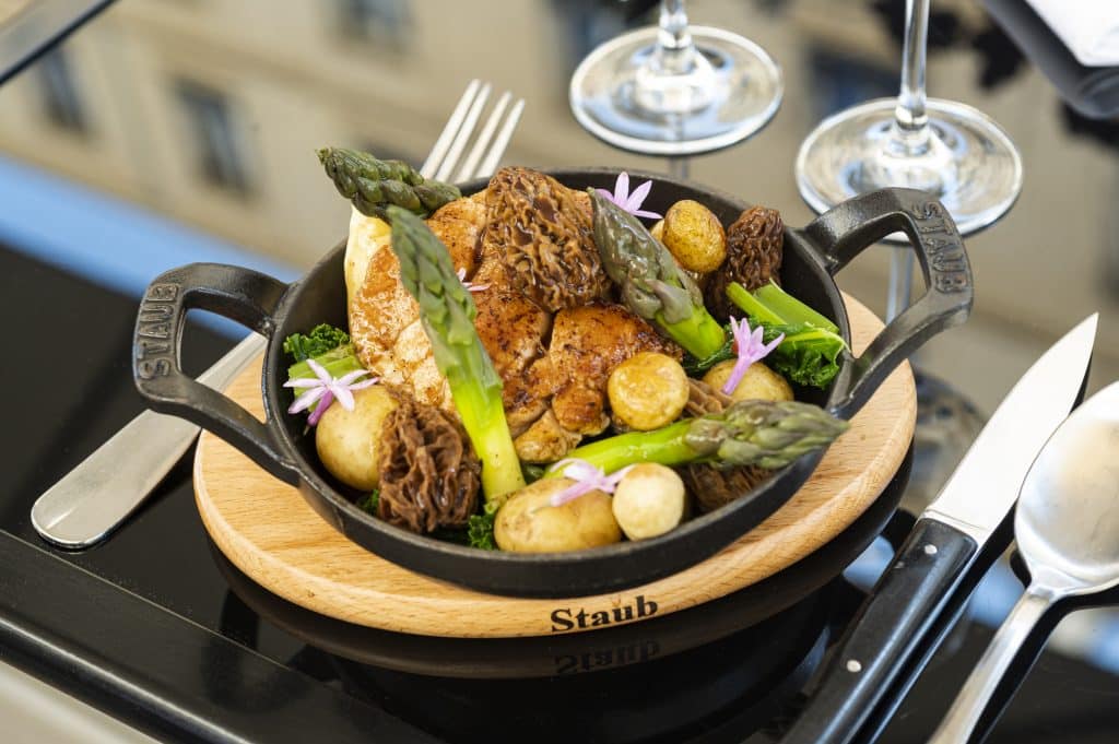 De 1998 à 2020, Émile Cotte a exercé son métier de cuisinier auprès des plus grands chefs de la capitale, comme Frédéric Anton du Pré Catelan, au bois de Boulogne (trois étoiles Michelin) et Alain Solivérès du Taillevent (deux étoiles). « Ces maîtres m’ont appris la rigueur et la précision, mais aussi la simplicité qui est la chose la plus difficile qui soit ! Anton a créé des plats d’anthologie à partir d’une simple botte de carottes ou d’un os à moelle… Le risotto à l’épeautre de Solivérès est resté dans les annales. Aujourd’hui, la cuisine doit être visuelle et “instagramable” avec du yuzu et quelques points de sauce qui n’ajoutent strictement rien au goût. Moi, la cuisine que j’aime n’est pas démonstrative mais généreuse, une cuisine d’aubergiste, avec tout ce côté laborieux dont on ne parle jamais à la télé. Ainsi, pour faire une bonne purée de pommes de terre “à la Robuchon”, je dois peler 30 kilos de rattes tous les jours… » Une purée divine, tel un dessert venu de l’enfance, qu’il réalise à partir de la pulpe de la pomme de terre, fouettée avec du bon beurre et du lait entier.