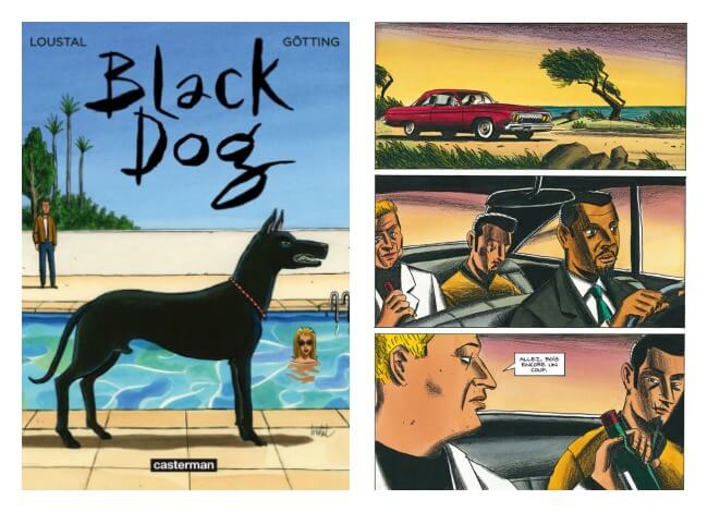 Dans Black Dog, remake de Noir (éditions Barbier & Mathon), il a convaincu Götting de transposer son histoire originale aux années 70-80. Le résultat est somptueux, d’une cruauté sans rédemption possible. Chaque planche pourrait être exposée dans un musée et rendre fou de rage les artistes officiels. Les collectionneurs ne s’y trompent pas et reconnaissent depuis longtemps la haute valeur picturale de ses œuvres. Dans cette aventure qui ressemble à une farce morbide, tous les ingrédients du désastre sont en marche : une blonde nympho à lunettes, un grand chien noir, une piscine bleu électrique, un inspecteur de police et des mauvais garçons prêts à tout pour une poignée de dollars. Le tout, dans un décor hollywoodien stylisé jusqu’à l’épure. Stefan Slovik, mécano fraîchement viré par son patron et ne maîtrisant que quelques mots d’anglais, va croiser la route de Monsieur Deville, un mafieux enragé qui ne lui laissera aucune porte de sortie. L’argent et le sexe ne sont que des prétextes au déchaînement des hommes. C’est de la tragédie antique avec de longues voitures américaines et une fille en bikini rouge sang.