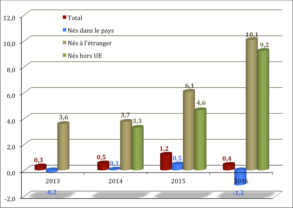 C’est particulièrement vrai pour l’Allemagne où la population née à l’étranger a augmenté de 10% en seulement une année (2016) alors que la population des natifs diminuait d’un peu plus d’1% (graphique ci-dessous).