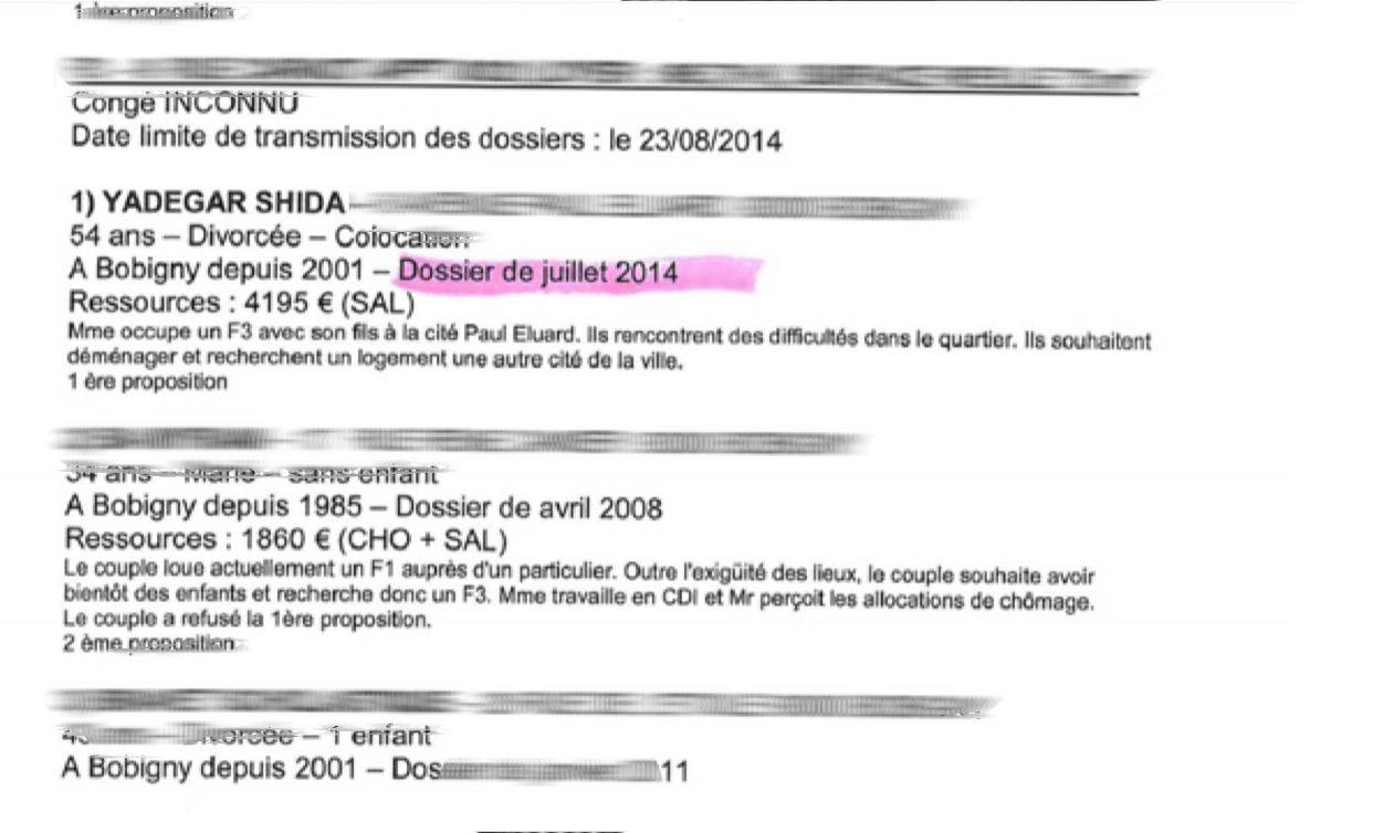 En juillet 2014, la mère de Kianoush Moughadam (Shida Yadegar) dépose une demande de logement à Bobigny. En septembre l’office HLM lui attribue un 75m2 alors qu’elle est célibataire et déclare plus de 4 000 euros de revenus. Or elle n’est pas du tout prioritaire, ni en termes d’ancienneté de la demande, ni en termes de revenus, ni en termes de situation. À côté, il y a un couple qui a un dossier datant de 2008, la demandeuse dit vouloir fonder une famille mais c’est impossible puisqu’elle habite un logement trop exigu, elle a 35 ans… c’est ça l’injustice.