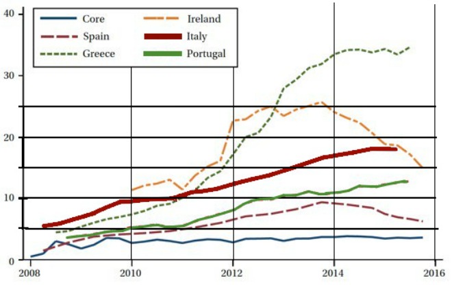 Il faut ici noter que le mouvement de la part des « mauvaises dettes » peut être lié à des causes très diverses. En Irlande et en Espagne, c’était une spéculation immobilière qui avait provoqué ce mouvement. Rien de tel dans le cas de l’Italie, et c’est ce qui rend la progression des mauvaises dettes bien plus inquiétantes. Ces dernières sont issues des prêts qui ont été consentis par les banques régionales italiennes aux PME de la péninsule. En réalité, c’est bien la stagnation économique de ces dernières années qui est la cause de cette crise bancaire qui arrive aujourd’hui en Italie.