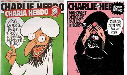 Depuis hier après-midi, la rue Compans, dans le XIXème arrondissement de Paris, est sous haute surveillance policière. C’est là en effet que se trouvent les locaux de Charlie Hebdo qui, dans son édition d’aujourd’hui, publie en pages intérieures de nouvelles caricatures de Mahomet, dessinées par les auteurs-maisons. La couverture du journal, plus soft, met en scène un musulman à turban et un juif à papillotes (voir ci-dessus).