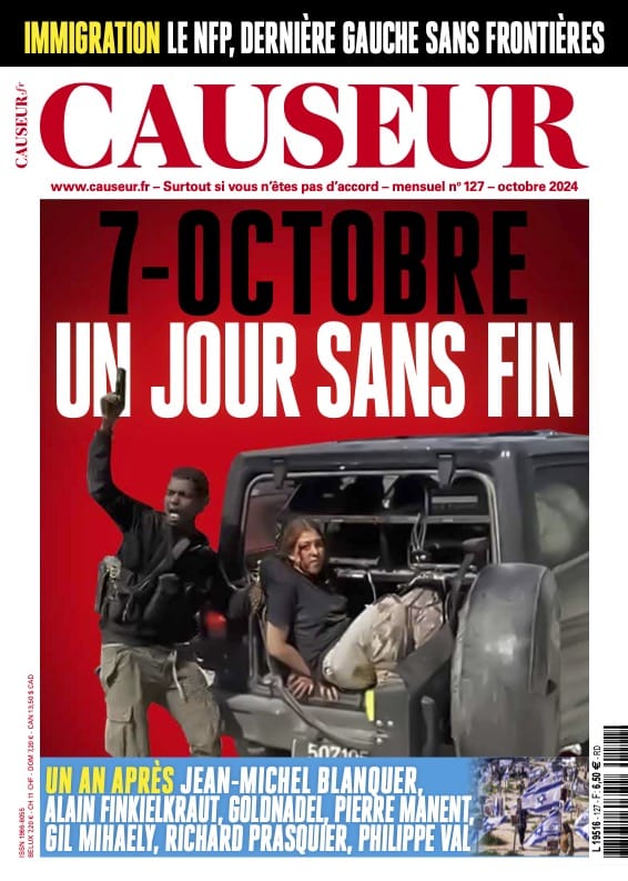Pourquoi le 7-octobre représente-t-il un jour sans fin, comme l’annonce la couverture du numéro d’octobre de Causeur? Parce que quelque chose s’est effondré ce jour-là, quelque chose qui n’était peut-être qu’une illusion mais qui tenait depuis la fin de la Seconde Guerre mondiale: le « jamais plus ça ».