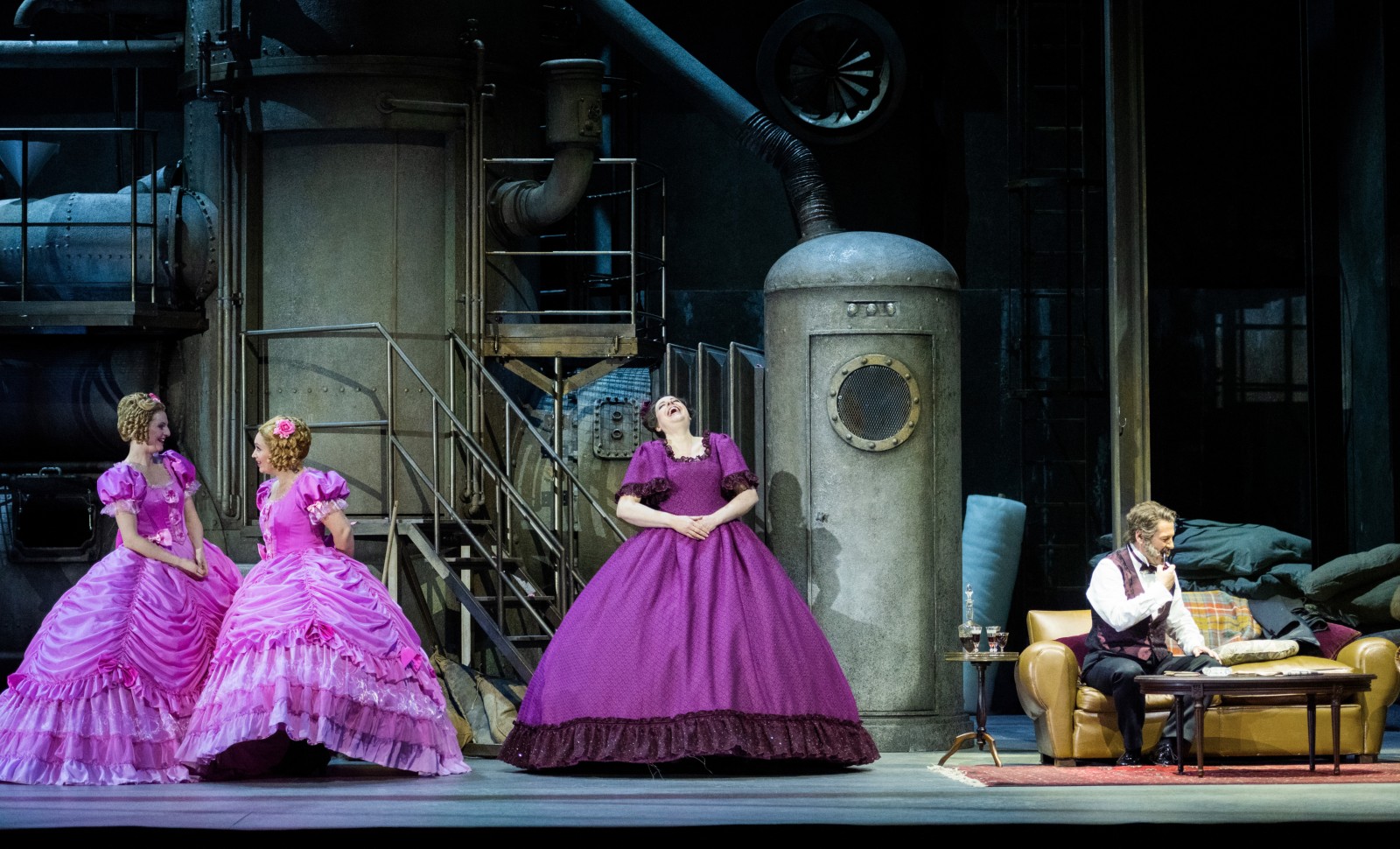 Cendrillon (dans le rôle, la soprano d’origine irlandaise Tarra Errgaught, légende vivante du Bayerische Staatsoper de Munich)n’a plus rien d’un conte pour enfants : Madame de La Haltière, génitrice de Lucette (car Cendrillon est ici pourvue d’un prénom) y figure une marâtre bourgeoise, antipathique mère-maquerelle tenaillée par une unique obsession : choper le parti le plus rentable en faveur de ses filles, Noémie et Dorothée. Choisissant avec tact de pasticher les opéras du XVIIIème siècle, ainsi que le fera un peu plus tard Richard Strauss pour le jeune Octavian du Chevalier à la Rose, Massenet travestit en femme le Prince charmant (chanté, au reste, avec une grâce absolue par la mezzo- soprano britannique Anna Stephany), tandis que la Fée, quant à elle, dans cette mise en scène 100% d’époque , pourrait-on dire, crépite d’ampoules à fort voltage, telle une authentique Fée-Electricité ; et que Pandolfe, le bonasse chef de famille rivé à son canapé anglais en cuir, semble bien souscrire à la tentation néo-rurale, avant la lettre: « Viens, entonne-t-il en effet, à l’adresse de sa petite Lucette/ Cendrillon dans le premier tableau du troisième acte, nous quitterons cette ville/où j’ai vu s’envoler ta gaîté d’autrefois/Et nous retournerons au fond de nos grands bois, / Dans notre ferme si tranquille, / et nous serons heureux, / Bien heureux, tous les deux… ».