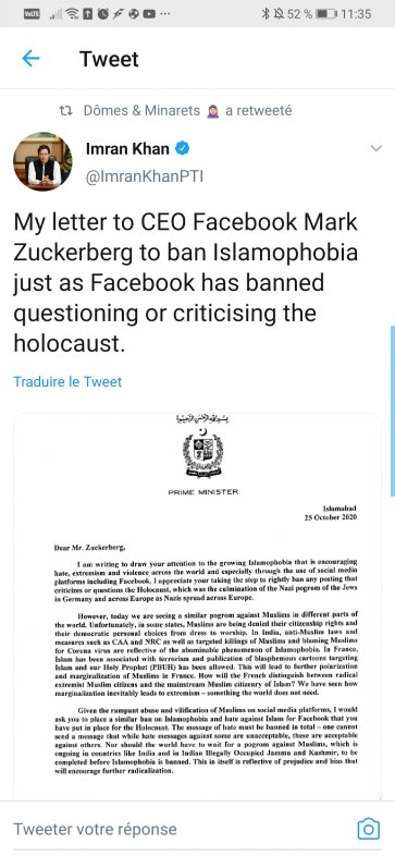 D’autres organes proches ont aussi témoigné de leur émoi. Marwann Muhammad du CCIF a par exemple déclaré : « C’est triste d’en arriver là, mais à force de cibler les musulmans sans cesse, la France se ridiculise une fois de plus à l’international. Cela cause du tort à son image, à son économie, sa diplomatie, et plus grave encore, sa crédibilité en matière de respect des droits humains ». Faisait-il référence, par opposition à la France, au Pakistan de l’ancien international de cricket Imran Khan semble-t-il très apprécié par Dômes et Minarets ? L’actuel premier ministre pakistanais a demandé que toute critique de l’islam soit interdite sur Facebook en plus de son soutien à l’appel au boycott des produits d’exportation français.