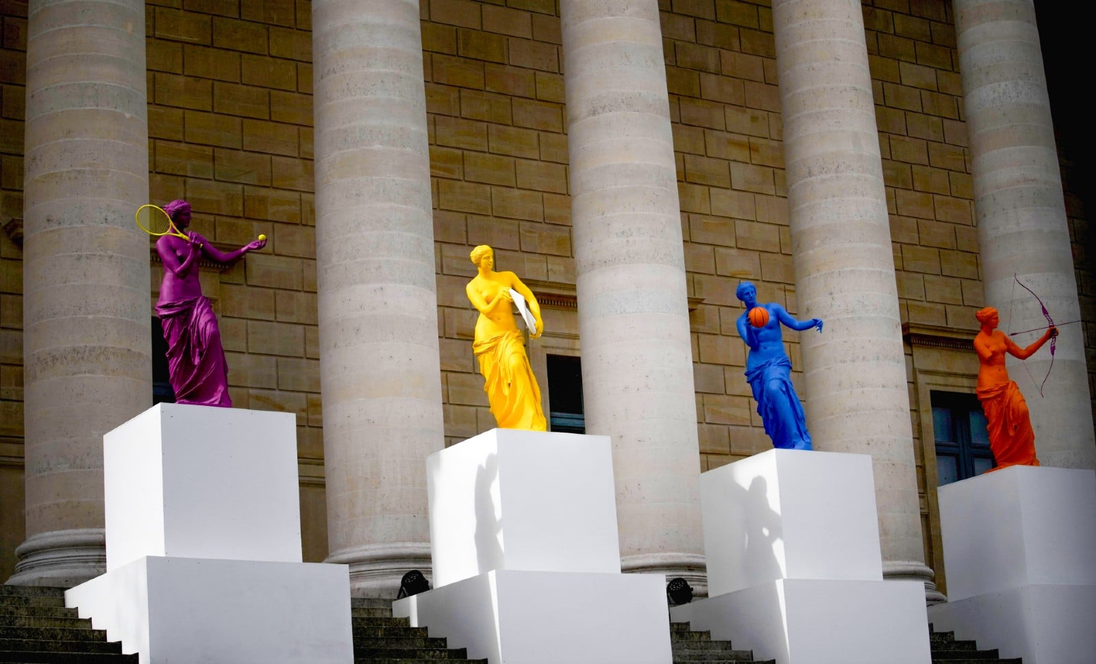 Nous les voyons trôner sur les marches de l’Assemblée nationale depuis le mois d’avril, derrière les statues de Sully, L’Hospital, d’Aguesseau et Colbert, célèbres serviteurs de l’État. Les six « Vénus de Milo » en résine polyuréthane flashy du plasticien Laurent Perbos réinterprétées en athlètes olympiques et paralympiques, et munies, pour l’occasion, d’une planche de surf, d’un ballon de basket, d’une raquette de tennis, d’un javelot, de gants de boxe et d’un arc, resteront devant le péristyle néoclassique du palais Bourbon jusqu’au 22 septembre. Cette installation éphémère, joliment intitulée « La Beauté et le Geste », célèbre le sport féminin, l’empathie et les luttes arc-en-ciel dans un lieu où la Sagesse et la Justice, représentées par les statues d’Athéna et de Thémis, s’effacent devant l’Amour de la non-discrimination, divinité moderne du moment, ni vraiment sage, ni vraiment juste.