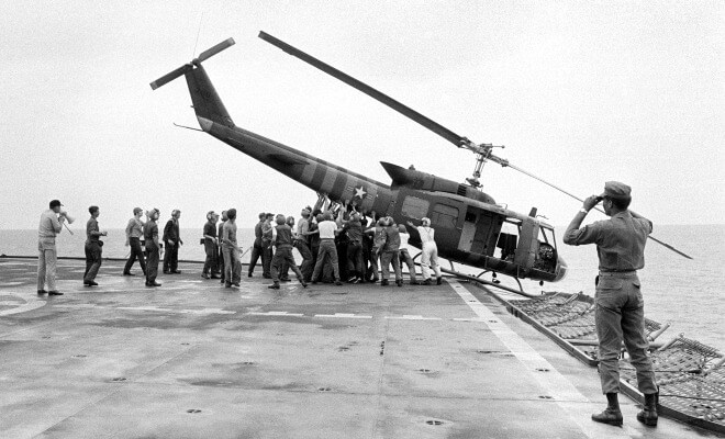 Et il y eut la fin, l’effondrement et le spectacle de la panique et de la débandade qui saisit Saïgon, le ballet des hélicoptères, le pont des porte-avions d’où on les jetait à la mer pour faire de la place. Le symbole de cette terrible défaite fut l’image de l’ambassadeur américain montant dans un de ces hélicoptères son drapeau plié à la main. Je garde aussi de ce moment un souvenir personnel, celui de mon père rentré d’Indochine après la défaite française et plein de respect pour les Nord-Vietnamiens qu’il comparait aux Prussiens et pour Giap leur chef. Et anticommuniste ou pas, l’humiliation américaine, relativisant la défaite française, ne lui provoquait pas un chagrin fou. Lors de leur offensive du début 1975, les dirigeants nord-vietnamiens prévoyaient une victoire pour l’année suivante. Lorsqu’il apprit la prise de Buôn Ma Thuột par l’APV en mars, il me dit simplement : « C’est fini ».