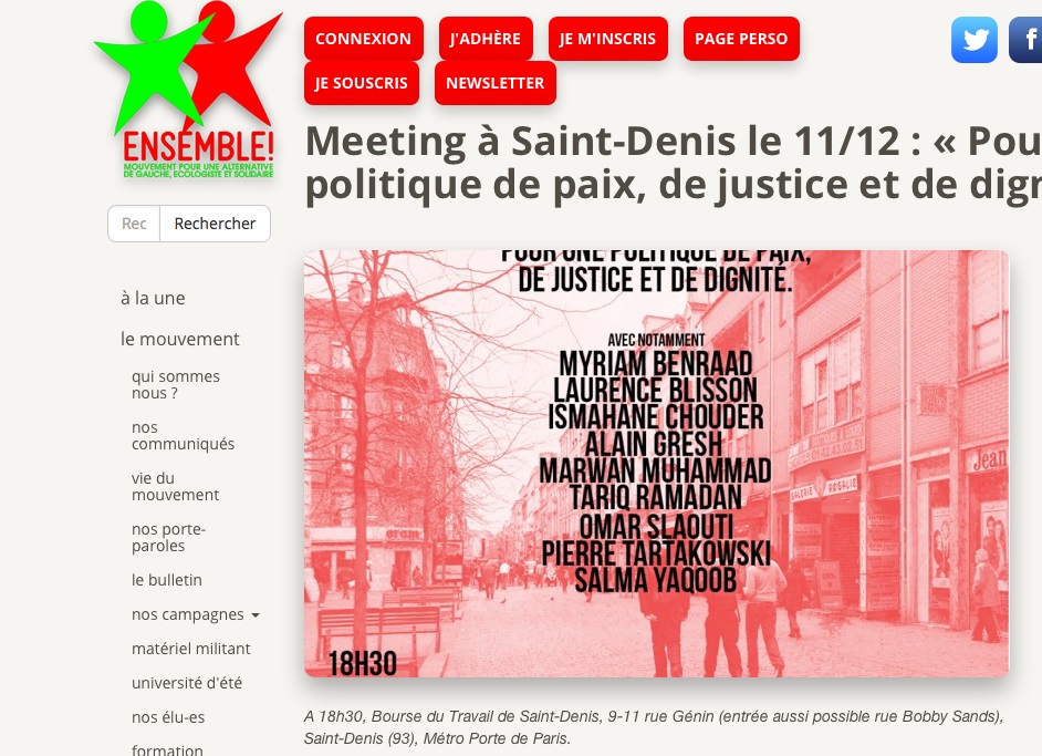Ce matin, sur le site d’« Ensemble ! », j’ai vu cet appel pour un meeting à Saint-Denis qui aura lieu demain soir « pour une politique de paix, de justice et de dignité », featuring Tariq Ramadan.