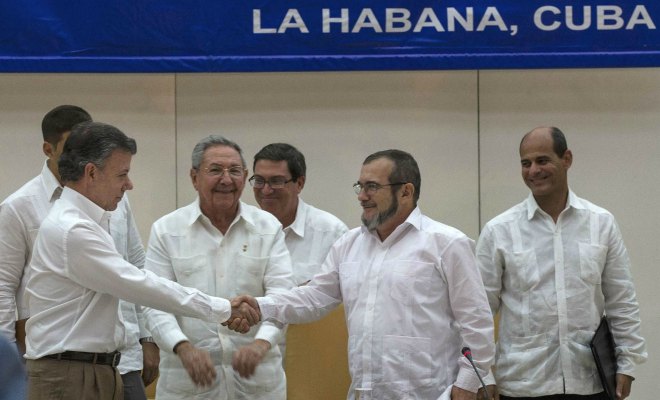 Dans un restaurant bon marché de Santiago de Cali, troisième ville du pays, on ne pouvait pas dire que l’émotion était palpable lors de la retransmission de la signature des accords de paix de la Havane, le jeudi 23 juin. Tandis qu’apparaissaient à l’écran Juan Manuel Santos, le président colombien, Rodrigo Londoño Echeverri alias Timochenko, dirigeant des Farc, Raul Castro, Ban Ki-moon pour l’Onu ou encore Enrique Peña Nieto, président du Mexique, l’attitude des clients frôlait l’indifférence ou presque. Il est vrai que la veille, la Colombie était éliminée de la Copa America par le Chili.