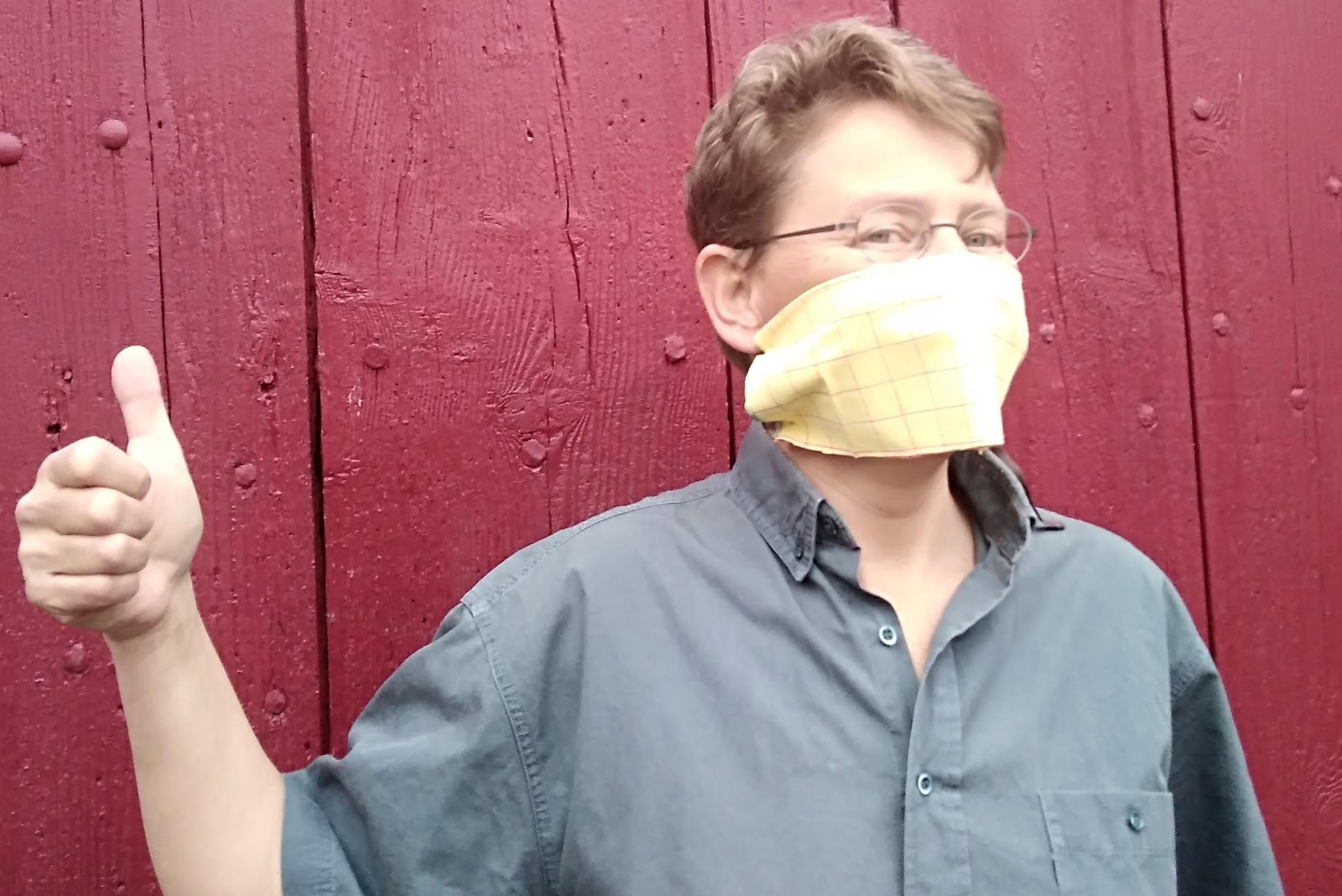 Je viens d’apprendre qu’une de mes anciennes collègues, retraitée depuis quelques années, s’est mise à la confection de tels masques en tissu. Soline (son nom n’a pas été changé) a des mains (et un cœur) en or. Ancienne anesthésiste de haut niveau, elle a d’abord proposé son aide à l’hôpital près de chez elle. Mais, quoique en bonne santé, elle était trop âgée pour ne pas prendre un risque majeur en se dévouant au contact de patients contagieux. Aussi, elle a décidé de fabriquer depuis chez elle des masques pour renforcer l’équipement défaillant de cet hôpital. Le résultat est magnifique (photo 1) ! Suivant son exemple, je vous envoie une photo de mes propres efforts. Je suis un peu moins douée qu’elle en couture, mais la protection n’attend pas l’élégance (photo 2) !