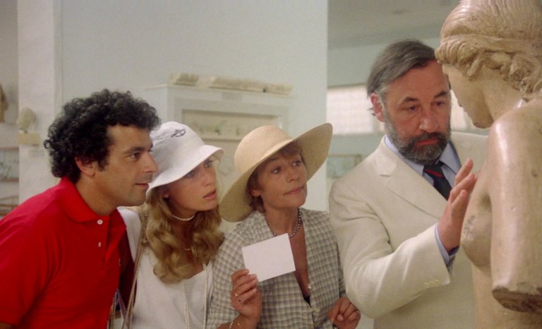 La comédie à la française d’alors, populaire et finaude, ne tombait pas dans la grosse farce qui tache. Durant ce voyage hellénique, on ferait la connaissance du jeune Pochet (irrésistible Francis Perrin), d’un commissaire local joué par l’inégalable Marc Dudicourt et puis surtout, la raison principale à ce dépaysement estival serait les jambes de Catherine Alric. Il y a des juppettes blanches qui ne s’oublient pas, des façons aussi de porter le chapeau, de faire l’imbécile, de parler à tort et à travers qui sont bien plus érotiques que les filles complètement dénudées.
