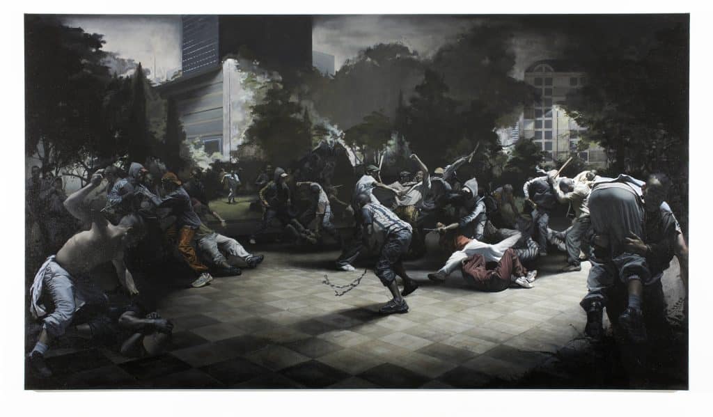Chez Guillaume Bresson (né en 1982), la violence prend les traits d’une chorégraphie baroque exécutée en survêtement dans des parkings souterrains, sur des dalles d’immeuble ou aux abords d’une station-service. Nourri de l’art du Tintoret, du Caravage et de Poussin, Bresson peint la violence anonyme des banlieues, avec ses rixes sordides, ses affrontements claniques et sa grande solitude. Il y a du Vélasquez dans les pieds qui semblent à peine toucher le sol, du Picasso dans les néons blafards et les lampadaires impuissants qui éclairent le drame. Vue à travers des siècles de peinture ancienne et moderne, notre violence contemporaine quitte ainsi l’esthétique photographique de l’hyperréalisme, renoue avec les représentations du Jugement dernier et du massacre des Innocents pour offrir une vision renouvelée du corps à corps, de la condition humaine et de sa chute inexorable. Bonheur de l’art contemporain lorsqu’il cite la peinture comme on cite un vers ou la première phrase d’un roman, lorsqu’il reprend tout à son compte sans rien détruire mais pour tout dépasser. Dans ces bagarres de sous-sol et de rue qui se déroulent sous nos yeux, on encaisse les coups de pinceaux en cherchant du regard coups de pied, coups de poing, battes et projectiles. La violence éternelle en jogging-tennis a le drapé d’une Artemisia Gentileschi et le clair-obscur d’un Caravage : la lumière frappe les corps dans les ténèbres et l’histoire des hommes vient se loger dans la subtilité du pli, blessure parmi les blessures. Le geste est le même depuis toujours : bras tendu pour frapper ou pour ramasser un corps tombé à terre.