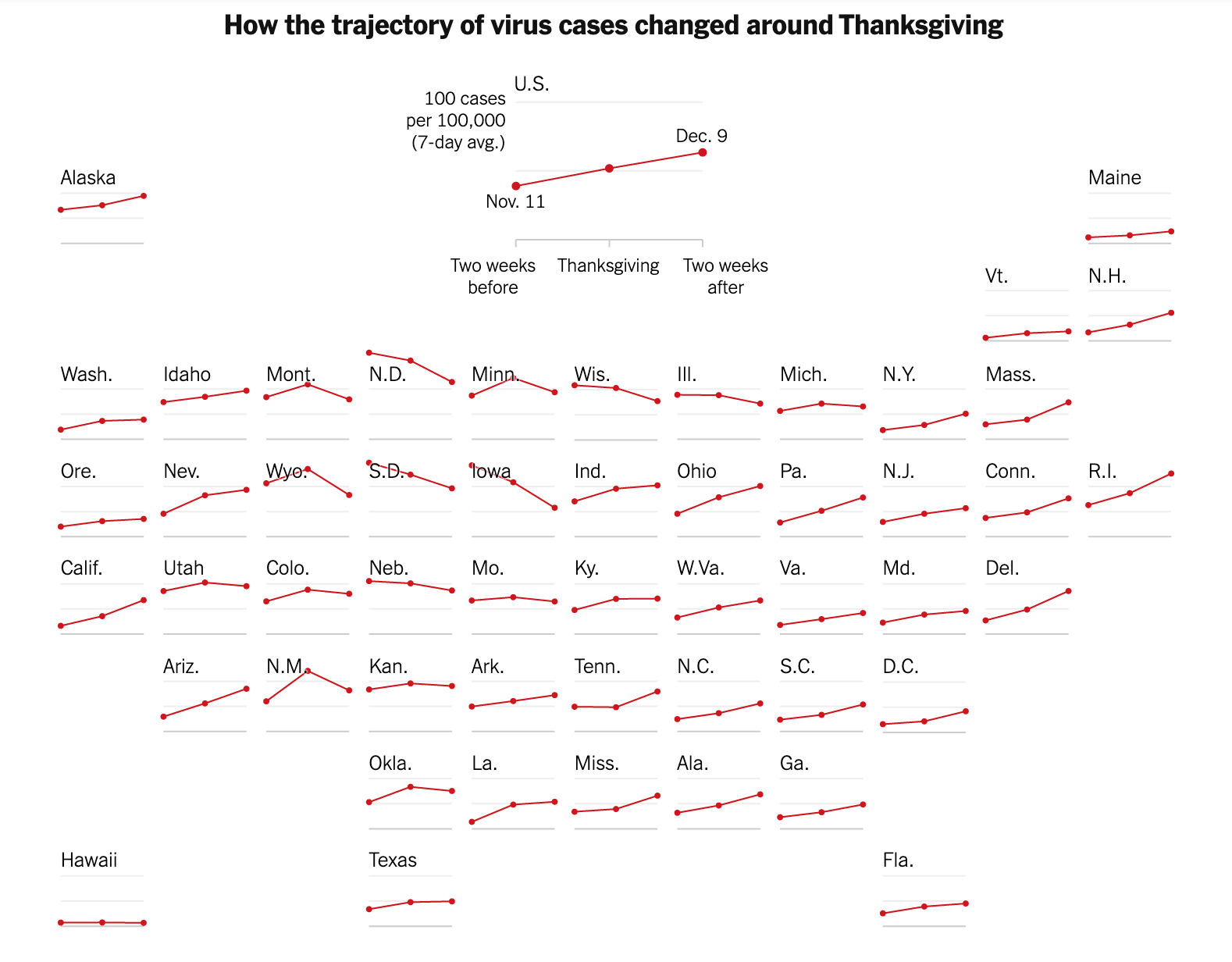 Or, les données scientifiques américaines ne vont pas dans le sens des autorités françaises. De manière générale, dans les États où la situation sanitaire empirait avant Thanksgiving, celle-ci a continué de s’aggraver. Et dans les États où la situation sanitaire s’améliorait avant que les Américains ne s’attablent autour de leur dinde traditionnelle, on n’a pas connu d’inversion de la tendance. Ce graphique ci-dessous est à cet égard assez parlant :