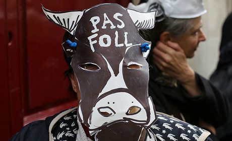 Aujourd’hui, une centaine d’agriculteurs déguisés en vache de la tête aux pieds se sont réunis devant le ministère de l’Agriculture pour meugler leur mécontentement. Rassemblés à l’appel de la Confédération paysanne, ils souhaitent lutter contre l’équivalent bovin des poulets en batterie : une ferme-usine dans la Somme qui concentrera 1000 vaches laitières et 750 génisses pour produire 8 millions de litres par an !