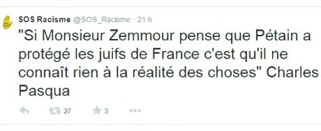 Hilarité enfin, en ce lundi, lorsque nous avons pris connaissance d’un tweet de SOS Racisme. L’organisation créée par Julien Dray et Harlem Désir et présidée aujourd’hui par Dominique Sopo a en effet tweeté solennellement une déclaration de Charles Pasqua, qui tançait Zemmour à propos de ses récentes acrobaties.