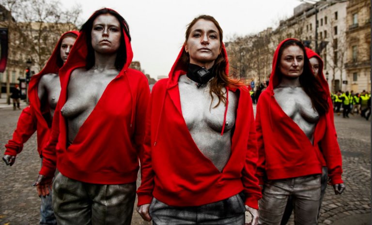 La semaine dernière, l’acte V des Gilets Jaunes fut marqué par une apparition inattendue, celle de Deborah de Robertis, artiste performeuse grimée en Marianne gothique les seins à l’air comme il se doit. Qui est-elle ?