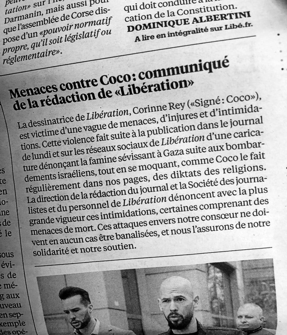 Alors, la meute se déchaîne. Des centaines de messages imbéciles, injurieux, menaçants et appelant au meurtre pleuvent sur la dessinatrice. « Que dieu ait pitié des frères Kouachi », écrit un internaute. « Je te souhaite le pire dans ta vie, ignoble personnage. Ils auraient dû te liquider le 7 janvier », déclare un autre. « Cours, Cours, pute. Tu seras abattue bientôt. Toute famille morte. », lit-on, également, en anglais. La dessinatrice de presse est soutenue par Libération. Dov Alfon, directeur de la rédaction du quotidien, a déclaré à l’AFP : « Nous condamnons, nous dénonçons avec force cette vague de menaces, injures et intimidations, certaines comprenant des menaces de mort que nous prenons très au sérieux. » Un communiqué de « soutien et de solidarité » a également été publié dans l’édition du mercredi 13 mars. D’autres se sont aussi offusqués des outrances des Insoumis. Parmi eux, la féministe Charlotte Rocher : « Il suffit d’un dessin humoristique sur le Ramadan à Gaza pour exciter la haine des Insoumis et coller des cibles sur une dessinatrice. Honte à Sophia Chirikou qui semble avoir un problème avec la liberté d’expression. » Fabien Roussel a également assuré Coco de « son plein soutien ».
