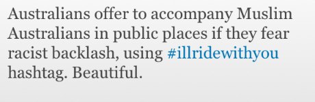 Cela dit, s’il avait dit les choses aussi clairement peut-être se serait-il exposé à l’accusation de vous-savez-quoi. Or le vous savez quoi est un danger qui nous menace tous. Ainsi d’après les sites spécialisés dans la mesure du buzz, le hashtag #Illridewithyou est au moment ou j’écris ces lignes, le mot-clic le plus utilisé au monde. L’idée précise de ce tag « Je voyagerai avec toi » c’est de signifier aux musulmans porteurs de signes extérieurs de musulmanitude dans les transports publics qu’on ne changera pas de bus ou wagon (ou d’avion ?) à cause de leur djellaba ou de leur burqa. L’idée générale est semble-t-il de lutter, lâchons-le mot, contre l’islamophobie.
