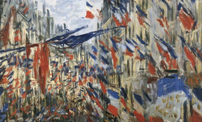 Une raison étymologique d’abord. On ne pavoise que pour exprimer sa joie, pas son deuil. Le verbe pavoiser lui-même a acquis des connotations péjoratives avec le temps qui lui donne le sens d’une joie un peu arrogante. On pavoise pour un quatorze-juillet : se souvenir de la magnifique toile de Monet, Rue Montorgueil, une de ses plus éminemment joyeuses. On ne pavoise pas, à tous les sens du terme, quand on va rendre hommage à cent-trente morts et que l’on réagit par une politique étrangère brouillonne et un état d’urgence. Etat d’urgence qui a eu promptement pour effet d’interdire les manifestations autour de la Cop 21, de perquisitionner les squats et les maraîchers bios et libertaires mais pas, étrangement, de fermer les hypermarchés.