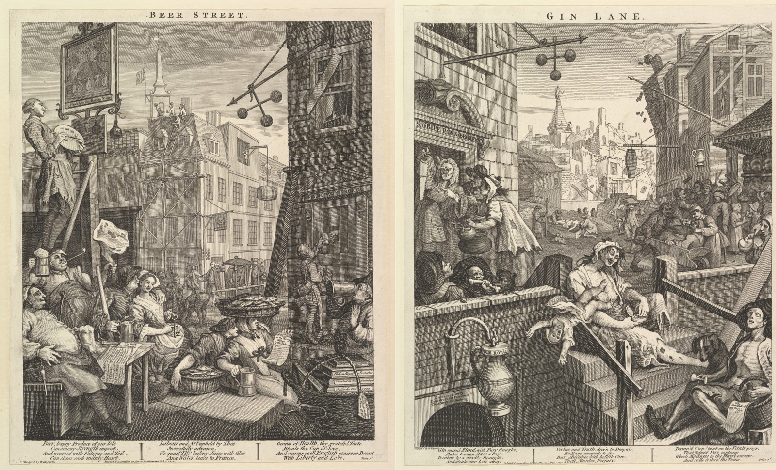 « Il n’y a rien de nouveau sous le soleil », proclame le livre de l’Ecclésiaste. Pourquoi les drogues feraient-elles exception à cette règle ? La Grande-Bretagne fournit un excellent exemple. Au début du XVIIIe siècle, les populations s’adonnent avec fureur au « gin craze », la folie du gin, lequel, souvent frelaté, détruit leur santé physique et mentale. C’est pourquoi, en 1751, le Parlement vote le « Gin Act » qui, de mesures fiscales en exigences de qualité, fait effectivement baisser la consommation de manière notable. Le bon peuple est alors encouragé à se tourner vers la bière, réputée pour ses bienfaits. En témoignent deux gravures célèbres exécutées par William Hogarth : Gin Lane et Beer Street. La première est construite autour de la figure d’une mère indigne et hébétée qui, ivre morte, laisse choir son enfant, alors que la seconde montre d’heureux travailleurs, la panse rebondie, se reposant de leur journée de labeur à grand renfort de pintes écumantes.