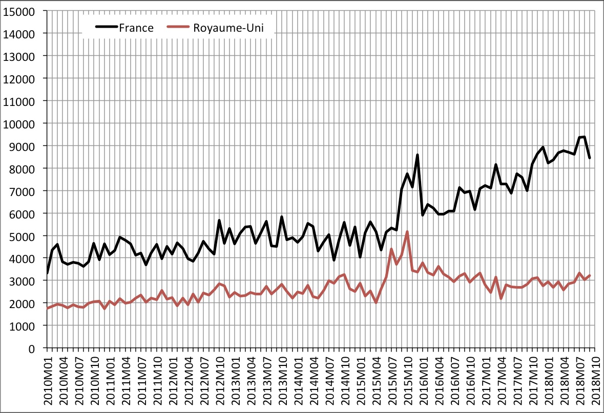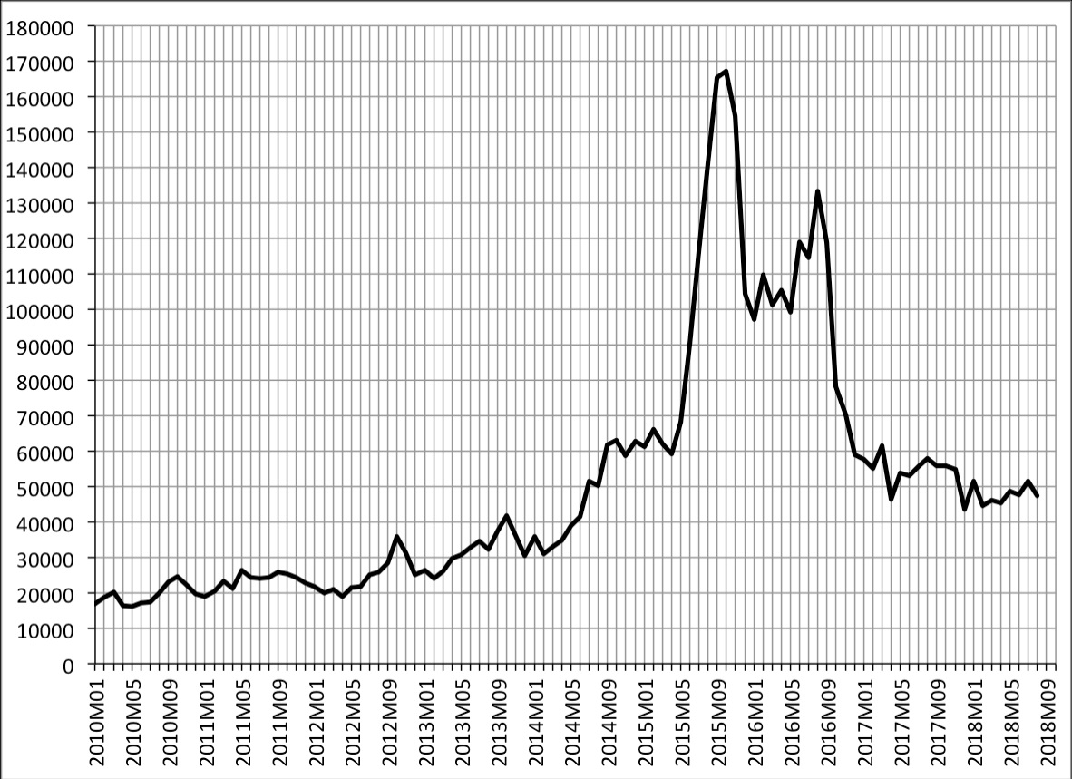 À l’échelle de l’UE28, la crise a été très concentrée sur les années 2015-2016, avec un pic en septembre-octobre 2015 au-dessus de 160 000 demandes mensuelles. La fièvre est retombée, mais on reste à un niveau qui est encore à peu près le double de celui des années 2010-2012.