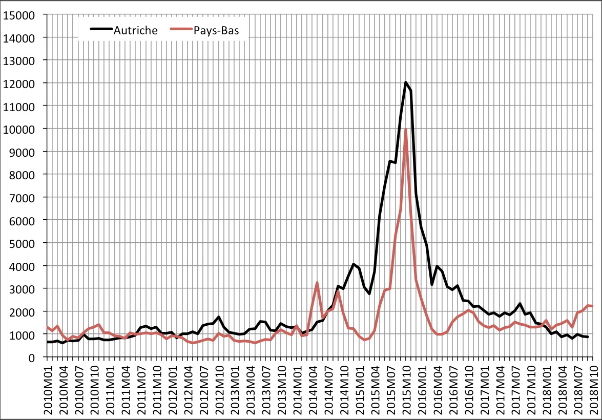 L’Autriche et, dans une moindre mesure relativement à sa population, les Pays-Bas ont aussi connu ce pic. En 2018, l’Autriche est revenue au niveau de 2010-2013. Aux Pays‑Bas aussi, le gros de la crise est passé, même si une tendance haussière s’est manifestée en 2018 signalant, peut-être, des mouvements secondaires de demandeurs d’asile à l’intérieur de l’Europe (graphique ci-dessous[tooltips content= »Dans les graphiques qui suivent, l’échelle est différente de celle du graphique précédent. »]2[/tooltips]).