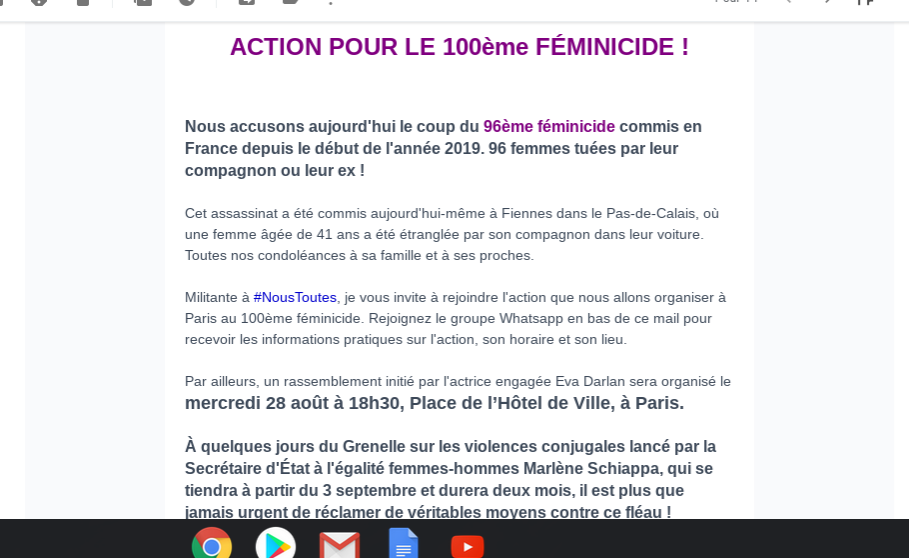 Je voulais vous parler d’un message que j’ai reçu il y a quelques jours. Il émanait du collectif #NousToutes. Ce message m’appelait à manifester pour le centième féminicide.