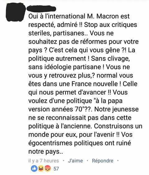 Pour le reste, on ne fera pas de mauvais procès à l’auteur du statut en lui faisant remarquer que l’expression « France Nouvelle » a de fortes connotations d’extrême droite: le macroniste de base contrairement à ses chefs, est en général assez inculte politiquement, sinon il ne trouverait pas Jupiter très nouveau puisqu’il a un programme qui date de Reagan.