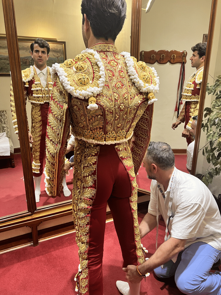 La corrida est hors du temps. Elle ne suit pas les modes. Son anachronisme le plus criant est peut-être celui du costume. Les toreros : ces hommes qui, en 2023 encore, affrontent des monstres cornus, le corps moulé dans des tissus de soie de couleurs vives, recouverts de broderies d’or et de brillants. C’est ainsi corsetés que les matadors partent au combat. Derrière ces costumes si riches, si abondants en détails raffinés, se cachent des tailleurs hors pair et spécialisés. Fermín est le plus renommé. Cette maison habille les plus grands toreros depuis près de soixante ans. Elle se trouve à Madrid, rue de la Aduana, près de la Puerta del Sol.