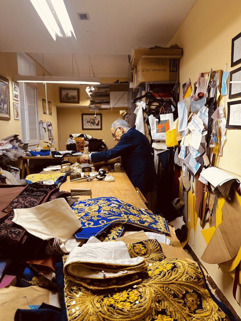 Comment devient-on tailleur pour torero ? Antonio nous raconte : « Ma mère, pour arrondir les fins de mois, faisait de la broderie à la maison. C’était un petit extra pour ne pas avoir à se servir du salaire de mon père. Mon frère et moi avons grandi en voyant ma mère accomplir ce travail. Elle brodait déjà pour les toreros. Elle ne faisait pas des habits de lumières entiers, mais les tailleurs sous-traitaient certaines tâches. Nous avons grandi dans cette atmosphère de tissus, de broderies et d’aiguilles. C’était quelque chose de naturel, de familier pour nous. » On sonne ! L’employé d’Antonio va ouvrir. Il fait entrer deux toreros mexicains. Ils viennent chercher des capes roses, celles dont on se sert pour donner les toutes premières passes à l’animal. « Fermín, c’est possible de prendre une photo avec vous ? » Le tailleur de légende prend la pose. Il est une figure mythique du monde des toros ! « Venez, je vais vous montrer l’atelier », nous dit Antonio.