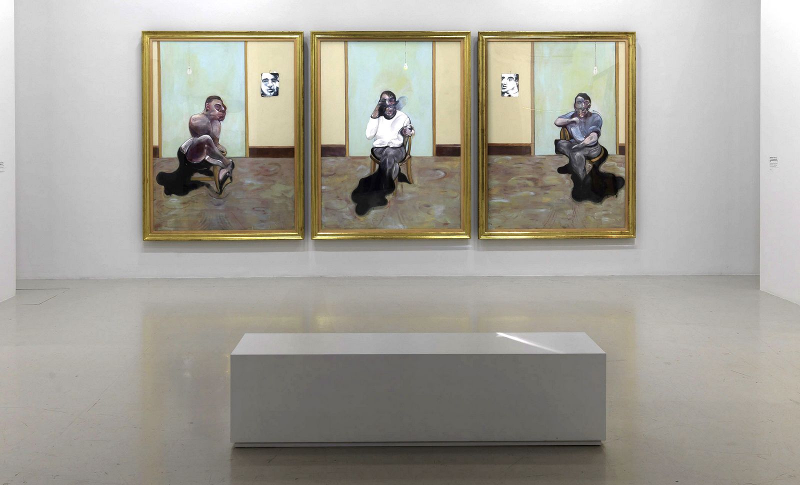 Il faudrait ajouter que Bacon est un bon client pour les photographes. Il a une vraie gueule. On a toujours de l’intérêt à le voir en photo ou en vidéo. Au jeu du portrait chinois, il tiendrait de la canaille prête à mordre. Les vues de son atelier-cagibi, incroyablement sale et chaotique, contribuent également à la sidération. Bacon a fait le choix décisif de la figuration dans une période dominée par l’art abstrait. Fuyant l’imitation mimétique du réel, il pratique une sorte de géométrisation molle et visqueuse. Son aventure est avant tout empirique. Il connaît, semble-t-il, peu d’artistes de son temps et s’encombre moins encore de références historiques. Il apprécie Picasso, Freud, Giacometti et quelques peintres anciens célébrissimes comme Rembrandt et Vélasquez. On pourrait s’étonner chez lui d’une culture artistique restreinte. Loin d’être une faiblesse, cette situation l’a sans doute décomplexé, lui procurant la liberté d’esprit nécessaire pour s’engager dans des voies nouvelles.