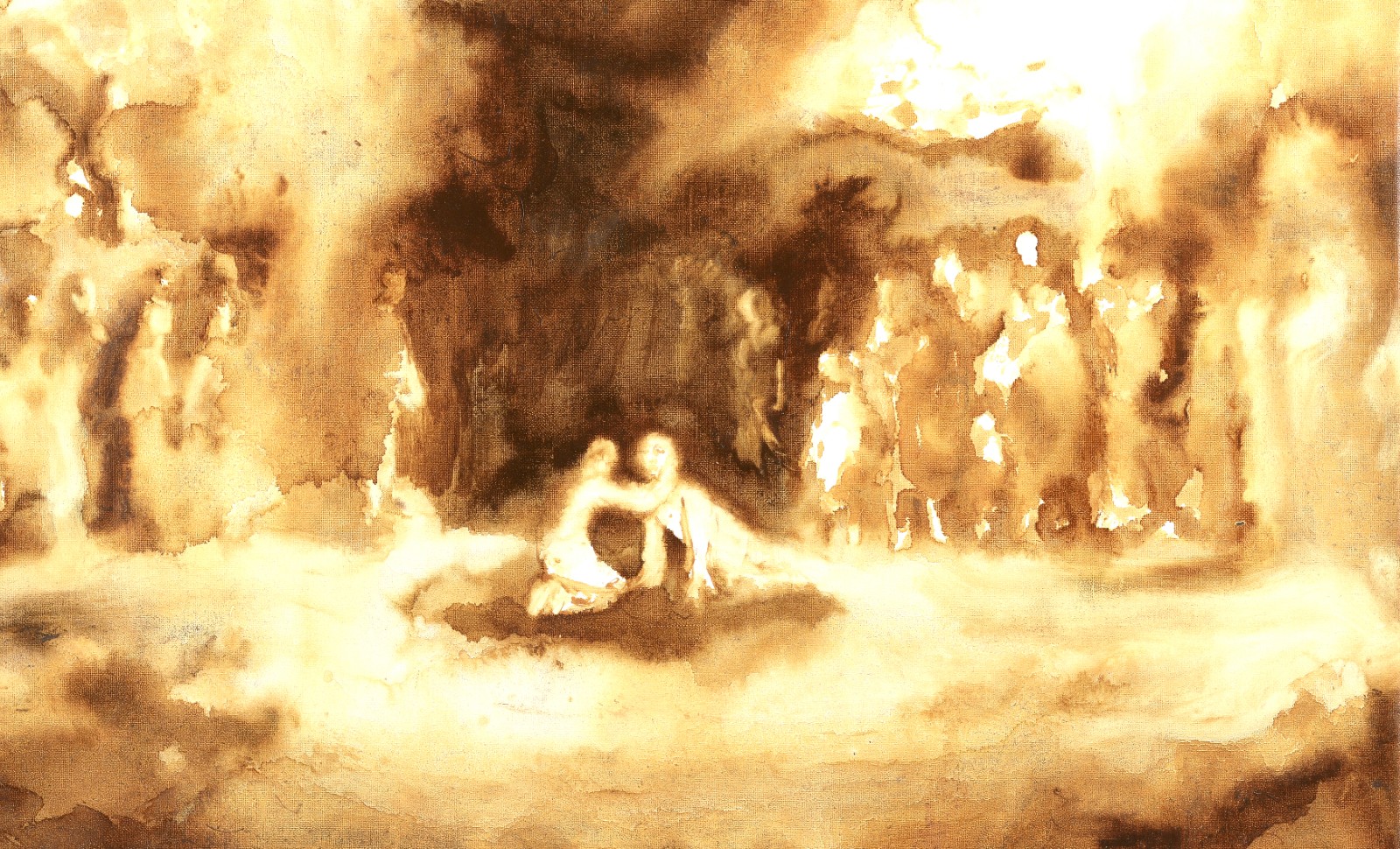 Tout l’art du peintre est de suggérer à la fois l’évidence de ce regard et la difficulté de le porter. Étalant à pleines mains des lavis d’encres, où le noir domine encore, ou un pigment terreux allongé d’essence (ce qui donne une palette allant du jaune pâle au brun profond), Boissoudy fait surgir de la surface blanche des univers où la lumière, toujours focalisée, signale l’instant gracieux. Le spectateur, lui, fait partie du dispositif, il appartient à la scène qu’il contemple : comme s’il était au fond de la pièce où le Christ rentre, dans la foule qui le regarde, dans le cercle de ceux à qui le Christ parle. Ce soleil, cette porte par où le jour entre, ce chemin éclatant, cette source, sont autant de points et de ponts qui manifestent une grâce active, un royaume déjà constitué, un règne présent pour ceux qui le désirent.