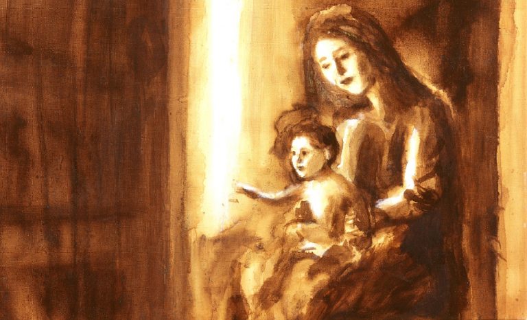 Les tableaux de cette exposition ont presque tous des titres qui sont des verbes : Chercher, Guetter, Naître, Revenir, etc. Si le règne vient, c’est qu’on le cherche, s’il existe, c’est qu’on le bâtit. Marie qui accouche sous les étoiles, couchée sur le sol autour de son enfant, comme la nuit enserrant la terre, c’est la promesse d’une lumière qui va illuminer des milliards de vies. Boissoudy reproduit cette toile plusieurs fois, sans qu’on sache s’il s’agit encore de Marie ou d’une autre femme, qui croit assez à la vie pour la porter et la donner. Cette pièce où des gens attendent devant une porte ouverte verra-t-elle surgir Jésus, un invité ou un passant ? Peu importe, elle est le royaume.